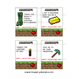 Custom made Valentines Day cards for your kids for school. Looking for something specific send me a message. Each page prints out an 8.5x11 with 4 Valentines Days cards at 3x4" each. You will need Adobe Reader installed on your computer to open and print the file. Each sheet can be printed as many times as you like.